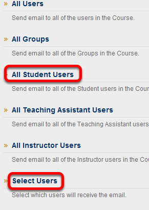 2. Choose the group you would like to send email to from the list. For all students, click All Student Users. For an individual student, use the Select Users option.