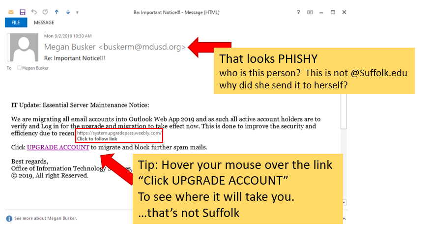 Phishing attempt to get you to click on an embedded URL web link. Notice that this link just asks to "Click UPGRADE ACCOUNT" trying to mask where it is going to send you. This link would request user credentials. Notice that if you hover your mouse over the link it would direct you to the PHISHING site. This site is obviously not Suffolk. Also notice that there is an urgency to act now with the message saying "verify and Log in ... to take effect now".