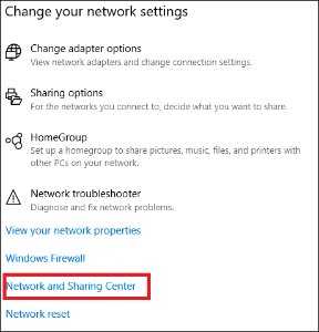 Type "network and sharing" in Cortana search box. If you can't find it, click the white circle to the right of the Windows Start button.
